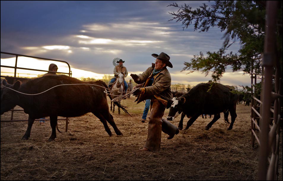 Branding started very early in the morning, which was great, because it meant I got to start off the day shooting in gorgeous light, but it was also a challenge because that first hour was complete chaos. It was cold, the light was fleeting and there were neither a warm-up opportunity for pictures nor a chance to get to know the landowners, ropers and ranch hands before I began to photograph them. The ropers were separating the calves and mothers, so people were mixed right in with some rather distraught 1,300-pound Angus cows. One calf broke loose and ran straight for me. My calf wrestling skills are not top notch, and the little guy was off before I even knew what was happening.