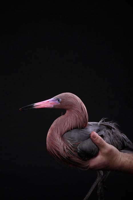 Probably the most difficult bird to photograph was the reddish heron. He’s an ornery little guy and if you get too close to him he’ll peck you hard enough to leave bloody little holes in your skin. The first thing he did when we put him on the backdrop was throw up his lunch of bait fish and then crap all over it, which meant we immediately had to flip the backdrop over. He then kept finding every hole to escape through. We had to build a huge enclosure of mesh panels, c-stands with sheets and people to keep him from escaping. He didn’t appear to be scared of any of us and it was almost like a game to him. He’d sit for a minute and then rush towards one of us and squawk. He eventually put a hole in my calf, but I made what I think is a great image of him that captures his personality. He looks like a little devil.