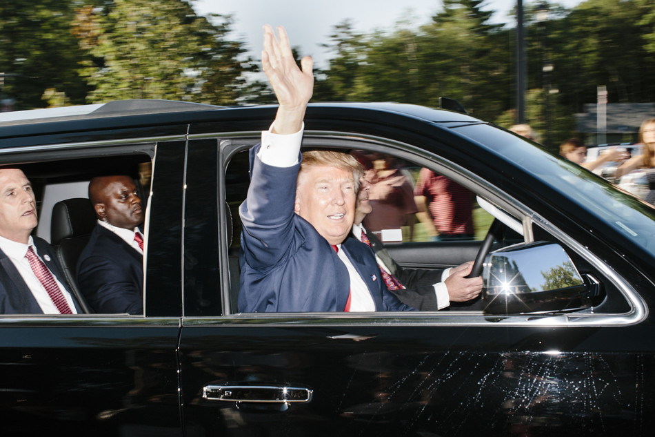 For the picture of Trump in the car, there really isn’t a lot to say. I’d been at a Scott Walker event right before but Walker was late. I left that event, knowing I wanted to get to the Trump event, but I hadn’t realized how bad the drive between the two was. It was about an hour or so of windy, narrow, rural roads across the state. I was late to the Trump event and hadn’t called ahead to get on the list, so wasn’t really sure what to expect. I got there and there was a huge crowd in a tiny room. Somebody gave me the last credential they had, but I didn’t like my position in the room. I walked outside to check out the crowd waiting for Trump. It was a bit of a walk around the building and on the way, I took a couple pictures of the sign aboveand then started walking to the crowd. I probably heard some people shouting and I turned around and there was Trump in the car. I was outside so using full power on the flash, so I only got one frame as he zoomed past. I didn’t have anything to focus on in the empty space where his car would occupy, so I really got pretty lucky with the shot. Then I kept walking up toward the crowd and kind of got swept up in his entourage as he entered the building to give his speech. That helped get me pretty close to the podium for the event and also I was in a good position to follow him back out to the crowd. You can see a wide edit in chronological order here: http://mscottbrauer.photoshelter.com/gallery/Donald-Trump-Rally-at-Weirs...